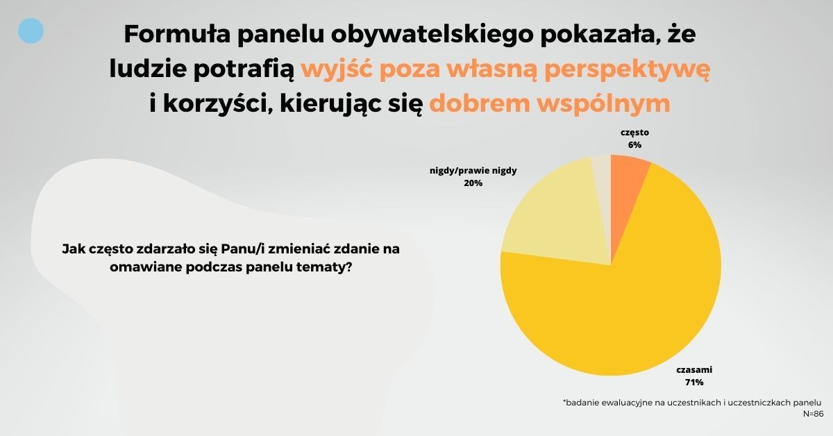 Panel obywatelski, jak i szerszy proces narady obywatelskiej, może więc być lekarstwem, które pozwoli ludziom odzyskać poczucie sprawczości i odbudować zaufanie do klasy politycznej, ale także wesprze władze kraju w podejmowaniu trudnych i złożonych decyzji.