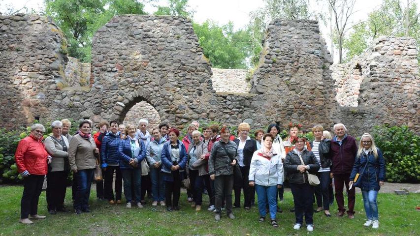 Aura, która spowija wieś Gryżynę była niewątpliwie kolejnym natchnieniem dla twórczości Mickiewicza. W tym miejscu lokalni organizatorzy zorganizowali dla uczestników podchody. Przemieżając blisko kilometrowy odcinek polnej drogi, seniorzy uważnie rozglądali się dookoła odnajdując wskazówki/tropy, które prowadziły do spisanych na karteczkach zadań i pytań, będących nawiązaniem do informacji przekazywanych przez przewodnika podczas odwiedzania kolejnych miejsc na naszym szlaku studyjnym. Z ich wykonaniem seniorzy nie mieli żadnego problemu, wykazując się zarówno wiedzą jak i umiejętnościami manualnymi, czego dowodem były artystycznie uplecione wianki. Nagrodę stanowiły kolorowe karteczki z tajemniczo brzmiącymi słowami. Ta niezwykle edukacyjna trasa zaprowadziła nas przed ruiny kościoła św. Marcina wzniesionego w XIII wieku. Majestatyczna, kamienna budowla, dźwigająca na sobie brzemię wieków, stoi na skraju wsi. Zachowane mury są pozostałością wczesnogotyckiego kościoła, zbudowanego z granitowych polnych kamieni. Nawa zbudowana była na rzucie prostokąta, z prezbiterium węższym od nawy, na rzucie kwadratu.