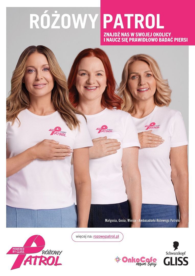 Na mapie Polski od kilku miesięcy pojawiają się kolejne Kluby Różowego Patrolu, by docierać ze swoją misją do kobiet i edukować je z zakresu profilaktyki raka piersi. W sumie jest ich obecnie 63. Współpraca z marką Gliss pozwoliła na zwiększenie zakresu działań tej inicjatywy. W społeczną akcję szerzenia świadomości na temat profilaktyki raka piersi zaangażowała się również Małgorzata Rozenek-Majdan, która wraz z Aleksandrą Gawlas-Wilińską, dyrektorką marketingu z firmy Henkel, została certyfikowaną Ambasadorką projektu.