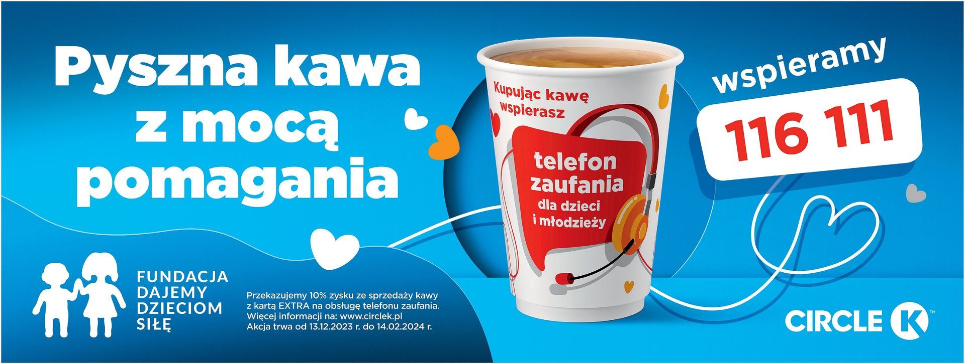 13 grudnia rozpoczęła się akcja „Kawa z mocą pomagania” na stacjach paliw Circle K. W ramach inicjatywy sieć po raz kolejny przekaże 10% zysku ze sprzedaży kawy z kartą programu lojalnościowego EXTRA na wsparcie 116 111, telefonu zaufania prowadzonego przez Fundację Dajemy Dzieciom Siłę. Ubiegłoroczna edycja pozwoliła sfinansować blisko 2150 połączeń i odpowiedzieć na ponad 800 wiadomości od dzieci i młodzieży poszukujących profesjonalnej pomocy psychologicznej.