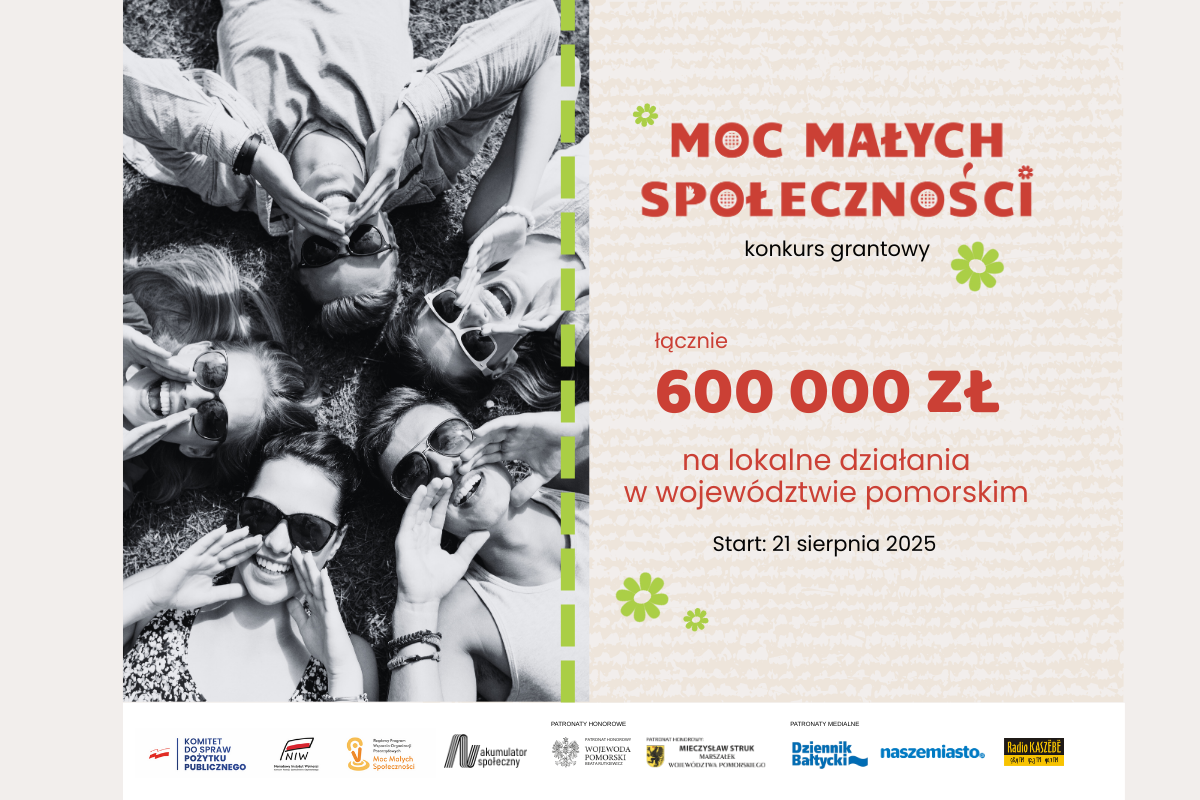W czwartek, 21 sierpnia rozpoczął się nabór wniosków o granty dla małych i średnich organizacji pozarządowych oraz trzyosobowych grup mieszkańców z 18 powiatów województwa pomorskiego. Można ubiegać się o dofinansowanie w wysokości od 5 000 do 10 000 zł na realizację lokalnych inicjatyw. W ramach naboru przewidziano spotkania informacyjne, konsultacje oraz pomoc przy pisaniu wniosków.