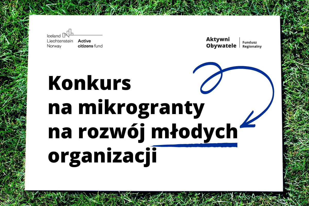 Zdjęcie kartki leżącej na trawie. Na niej tekst: Konkurs na mikrogranty na rozwój młodych organizacji. Strzałka wskazuje na słowo "młodych". W lewym górnym rogu logo Programu Aktywni Obywatele z tekstem: Iceland, Liechtenstein, Norway. Active Citizens Fund. W prawym górnym rogu znak Programu Aktywni Obywatele Fundusz Regionalny.
