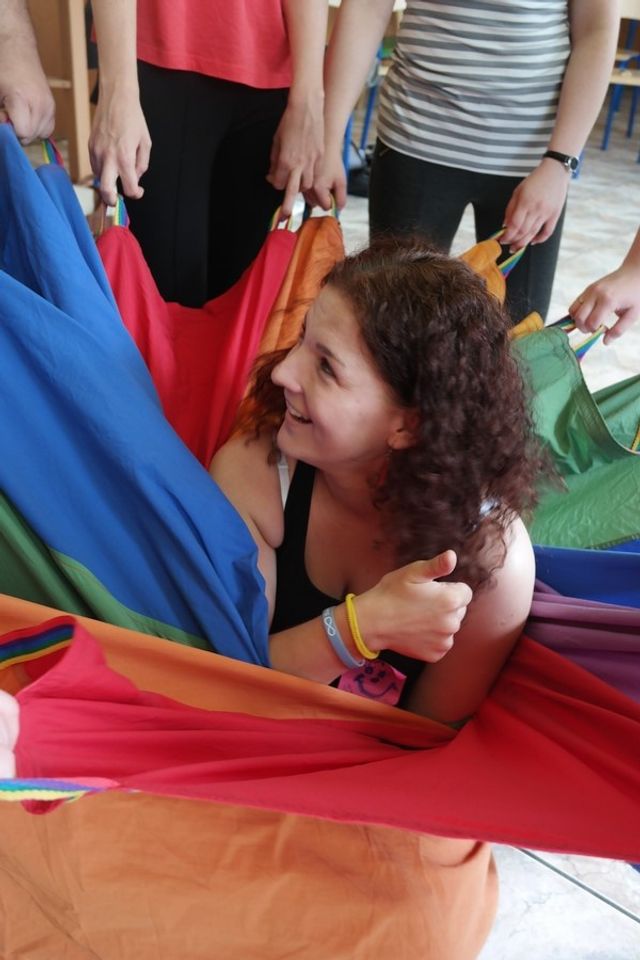 Była też chwila na relaksującą podróż na kocu, czy „odwijanie się” z kolorowej chusty, do którego ustawiła się cała kolejka chętnych. Na koniec rozegraliśmy finałowy mecz, przy użyciu tej chusty.