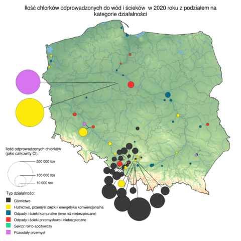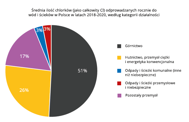 Analiza danych wskazuje, że branżą odpowiedzialną za większość zrzutów chlorków do wód i ścieków – a więc za zasolenie wód rzecznych w Polsce – jest górnictwo (51,2% emisji łącznie do wód i ścieków). Źródłem chlorków w tej branży są wody podziemne, które zakłady górnicze odpompowują w ramach prowadzonych odwodnień, koniecznych do wydobycia węgla. Im głębiej sięgają wyrobiska kopalni, tym bardziej zasolona woda. Regionem, w którym zrzuty chlorków są największe, jest Górny Śląsk.