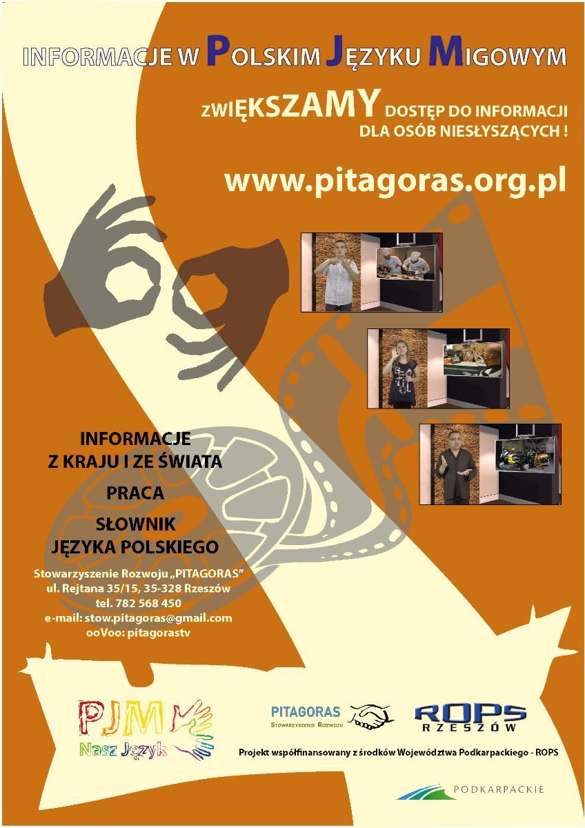 Stowarzyszenie Rozwoju PITAGORAS w Rzeszowie zaprasza do odwiedzania strony internetowej www.pitagoras.org.pl, na której w okresie od sierpnia do listopada 2014 umieszczane są informacje dla osób głuchych w Polskim Języku Migowym.