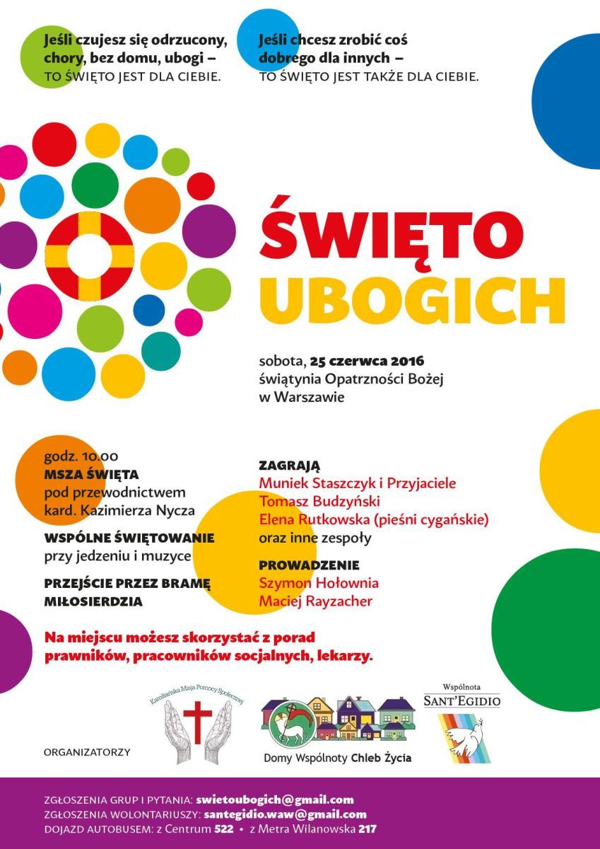 Święto Ubogich odbędzie się 25 czerwca w Warszawie na polach przy Świątyni Opatrzności Bożej. Obecność zapowiedzieli m.in. Rzecznik Praw Obywatelskich, Adam Bodnar, Tomasz Budzyński, Szymon Hołownia, kardynał Kazimierz Nycz, Muniek Staszczyk i Maciej Rayzacher. Organizatorzy – Wspólnota „Chleb Życia”, Kamiliańska Misja Pomocy Społecznej oraz Wspólnota Sant’Egidio – spodziewają się około 1000 osób.