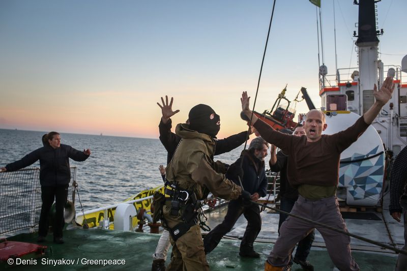 Rosyjskie służby bezpieczeństwa zjeżdżają z helikoptera na pokład Arctic Sunrise i przejmują statek, trzymając go na muszce po tym, jak pięciu działaczy Greenpeace International próbowało wspiąć się na „Prirazłomną”, platformę wiertniczą obsługiwaną przez rosyjskiego giganta energetycznego Gazprom, na Morzu Peczorskim. Aktywiści przybyli tam, by pokojowo zaprotestować przeciwko arktycznym wierceniom naftowym.