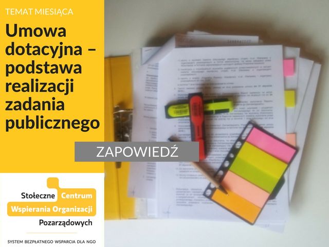 "Umowa dotacyjna – podstawa realizacji zadania publicznego" to temat, którym przez najbliższy miesiąc będziemy się zajmować w Stołecznym Centrum Wspierania Organizacji Pozarządowych (SCWO).