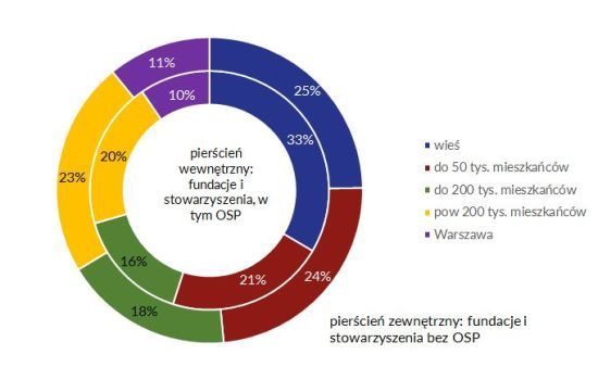 W pierwszym przypadku organizacje wiejskie stanowią 33% sektora, a kolejne 21% to stowarzyszenia i fundacje z miejscowości do 50 tysięcy mieszkańców. Kiedy OSP (zlokalizowanych w większości na wsiach) nie są uwzględniane, odsetek organizacji z terenów wiejskich w całym sektorze spada do 25%, ale łącznie ze stowarzyszeniami i fundacjami z małych miejscowości (do 50 tysięcy mieszkańców) ciągle stanowią niemal połowę wszystkich. Z kolei podmioty z dużych miast (powyżej 200 tysięcy mieszkańców) stanowią – w zależności od ujęcia – od 30% do 34% całego sektora.