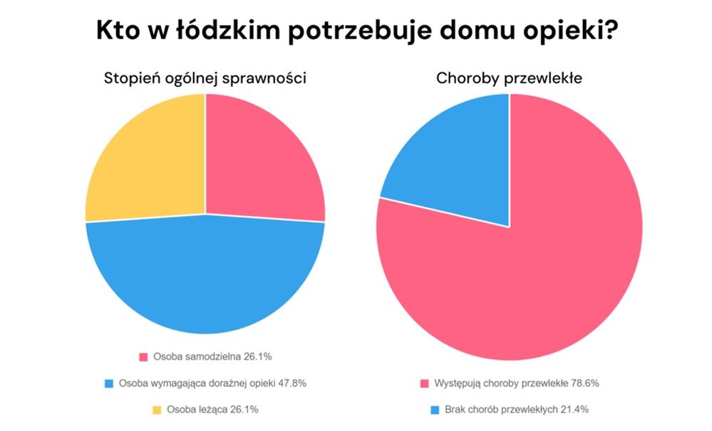 Za decyzją o poszukiwaniu miejsca w domu opieki, obok podeszłego wieku, często stoją problemy zdrowotne czy utrata samodzielności w wykonywaniu codziennych czynności. W województwie łódzkim z chorobami przewlekłymi zmaga się 78,6% seniorów oczekujących na miejsce w placówce opiekuńczej. Najczęściej są to: nadciśnienie tętnicze, demencja i cukrzyca. Z kolei pod względem stopnia ogólnej sprawności, 47,8% seniorów z województwa łódzkiego wymaga doraźnej pomocy, a 26,1% to osoby leżące. Odsetek osób samodzielnych również wynosi 26,1%.