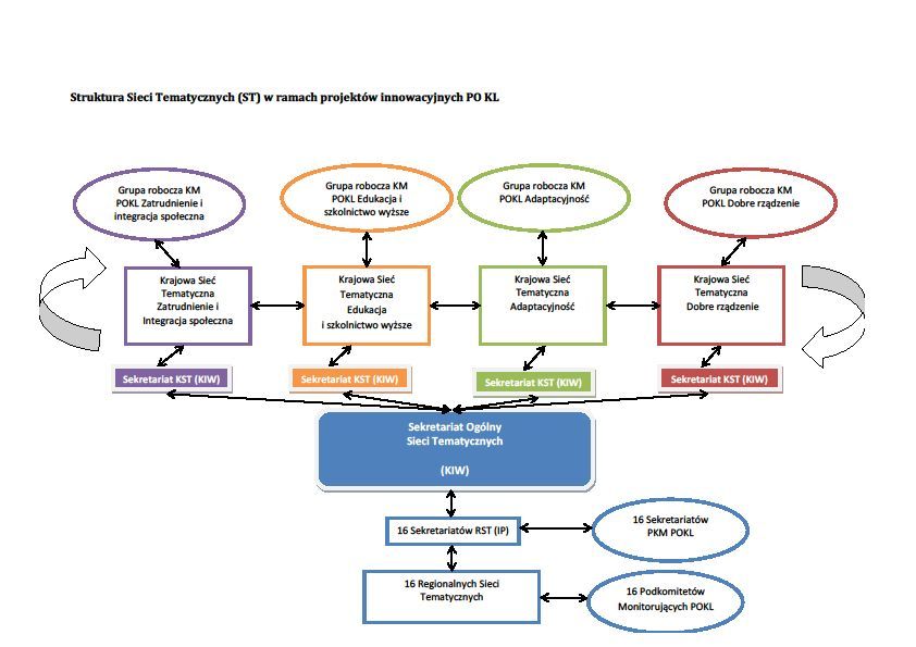 Struktura, czyli podział na Sieci Krajowe i Regionalne, odnosi się do Priorytetów PO KL wdrażanych centralnie i regionalnie. Obszary wsparcia Europejskiego Funduszu Społecznego, w oparciu o które funkcjonują cztery Krajowe Sieci Tematyczne, są reprezentowane zarówno w komponencie centralnym PO KL, jak i w komponencie regionalnym (za wyjątkiem obszaru dobrego rządzenia). Dlatego też koncepcja Sieci Tematycznych zakłada współpracę oraz wymianę informacji między KST i RST. Dzięki temu działania podejmowane na obydwu poziomach na rzecz innowacyjnego rozwiązywania problemów identyfikowanych w obszarach wsparcia EFS nawzajem się uzupełniają, zaś osoby uczestniczące w pracach Sieci będą mogą poszerzać swoje doświadczenia.