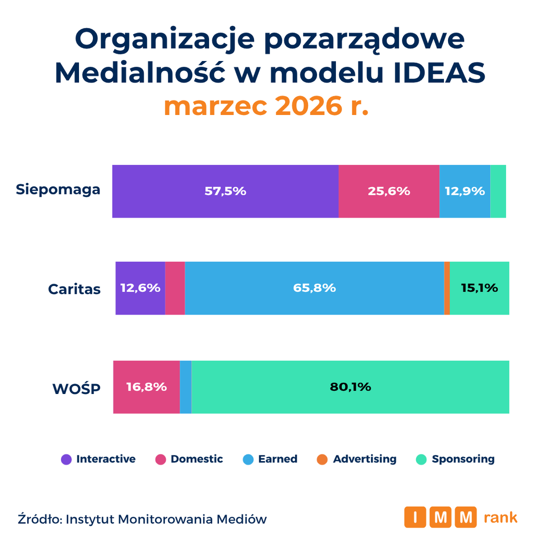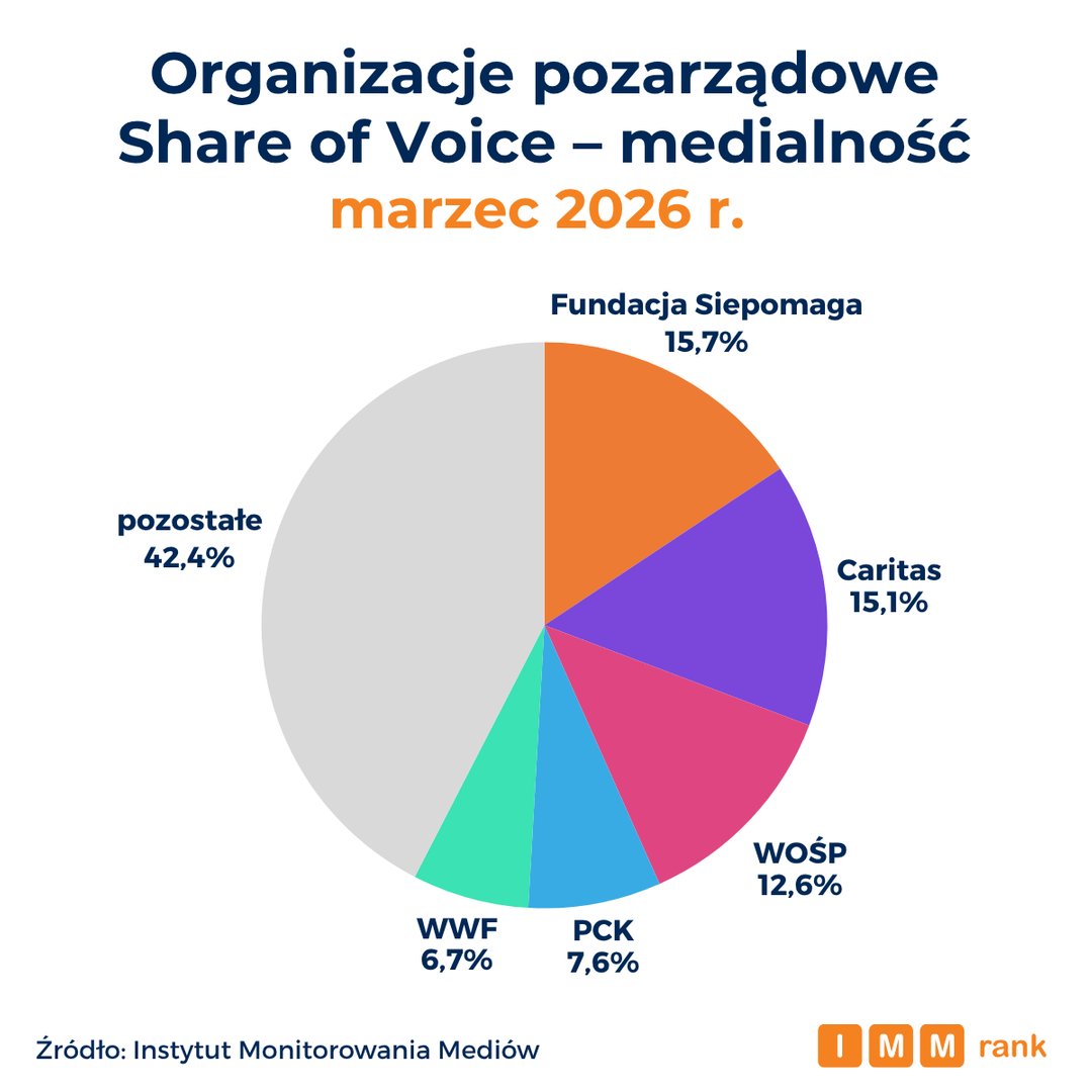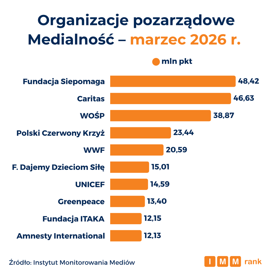 Fundacja Siepomaga, Caritas oraz Wielka Orkiestra Świątecznej Pomocy są na czele rankingu najbardziej medialnych organizacji pozarządowych marca 2026 r. – wynika z danych Instytutu Monitorowania Mediów (IMM).