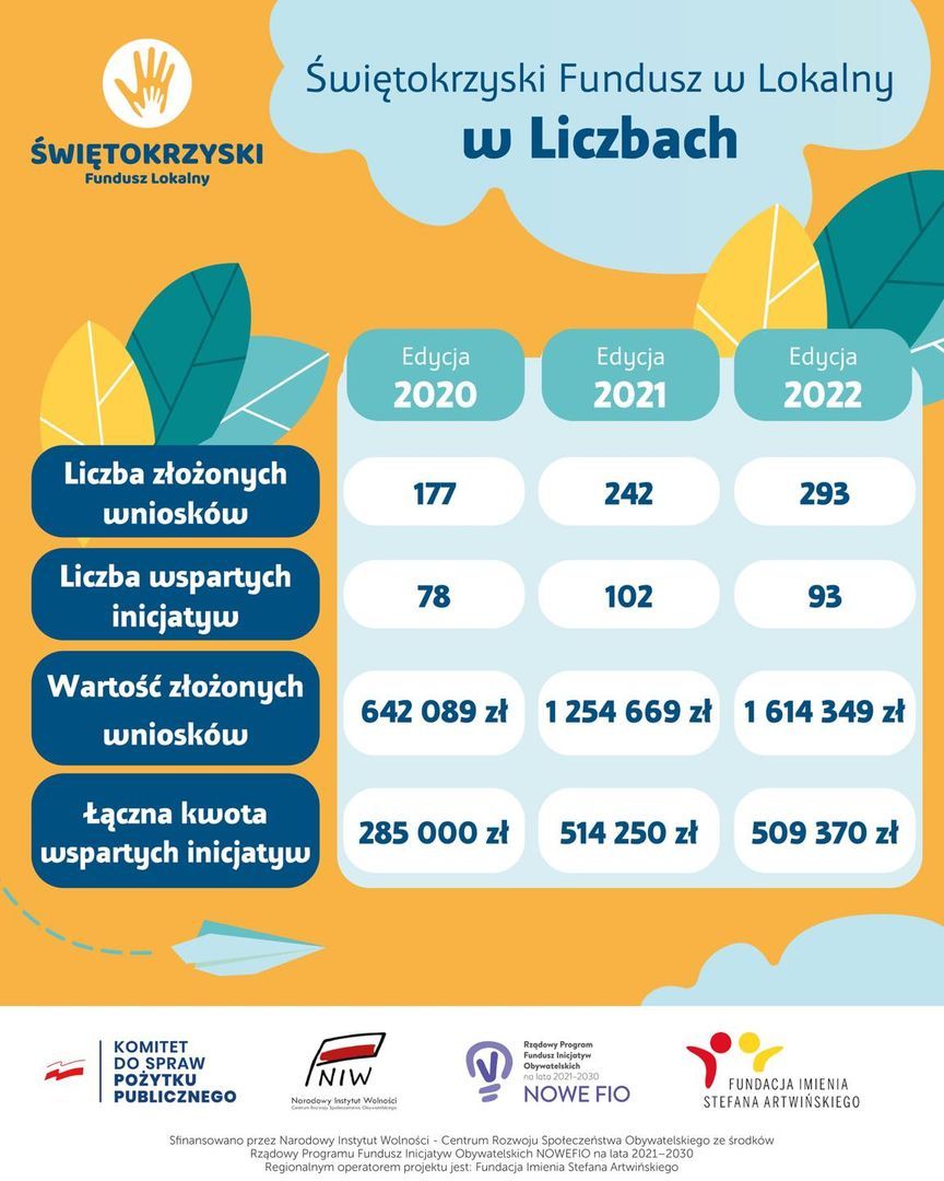 Na przestrzeni lat 2020-2023 do Programu Świętokrzyski Fundusz Lokalny złożono 1126 wniosków na łączną kwotę 5 851 762 tys. zł. Dofinansowanie udało się pozyskać 375 organizacjom, a wartość dofinansowania wyniosła 1 813 654 zł.