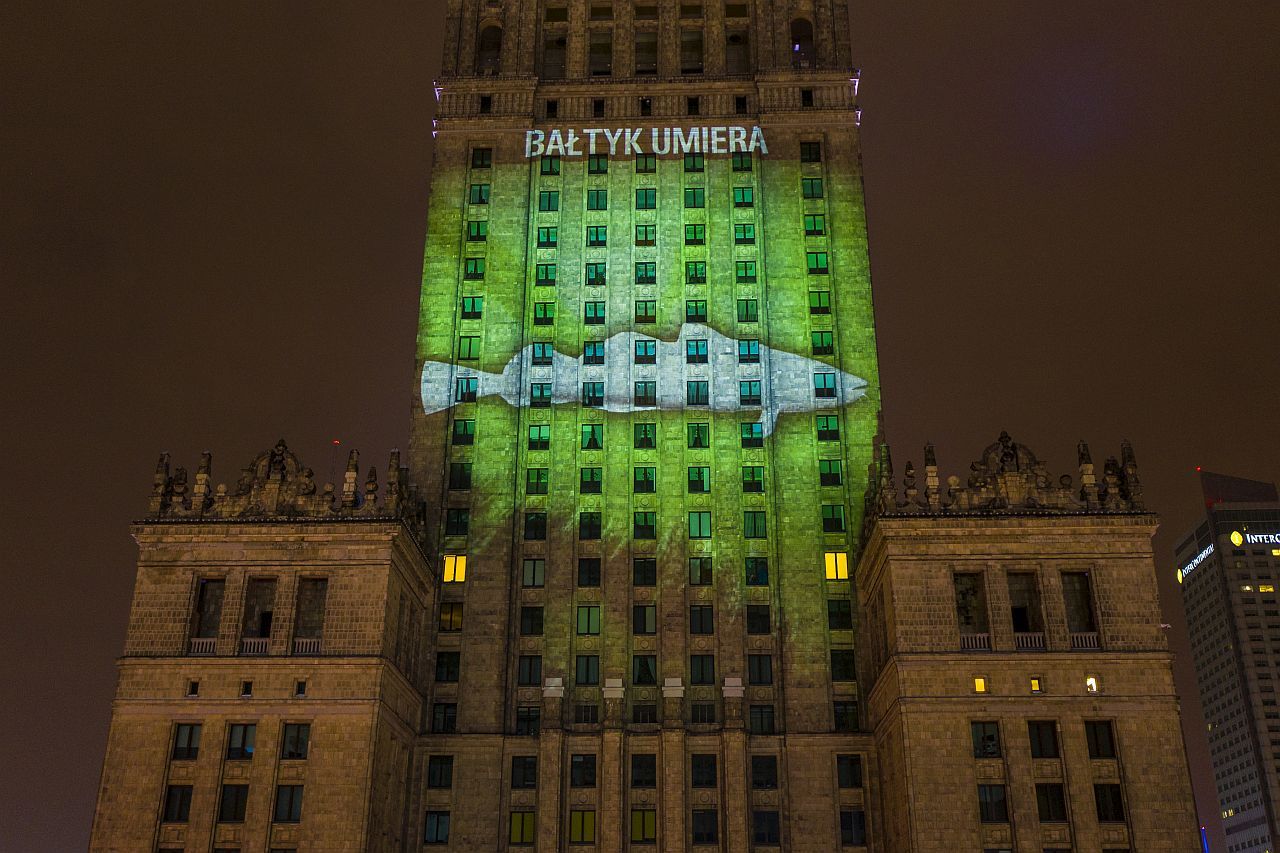 Na fasadzie Pałacu Kultury i Nauki w Warszawie 24 marca wieczorem pojawiło się wezwanie do działania. Projekcja z widokami falującego morza zajęła przestrzeń frontalnej elewacji PKiN. Obrazy przypominają, co możemy stracić. Morze Bałtyckie to dla wielu z nas nie tylko cenna przyroda, ale też… całe morze wspomnień. Wakacje, spacery po plaży, szum fal, widok zachodzącego słońca. To wszystko może stać się tylko wspomnieniem. Jednak nie jest jeszcze za późno, aby ratować Bałtyk. Działajmy w imię wszystkiego co w nim kochamy.