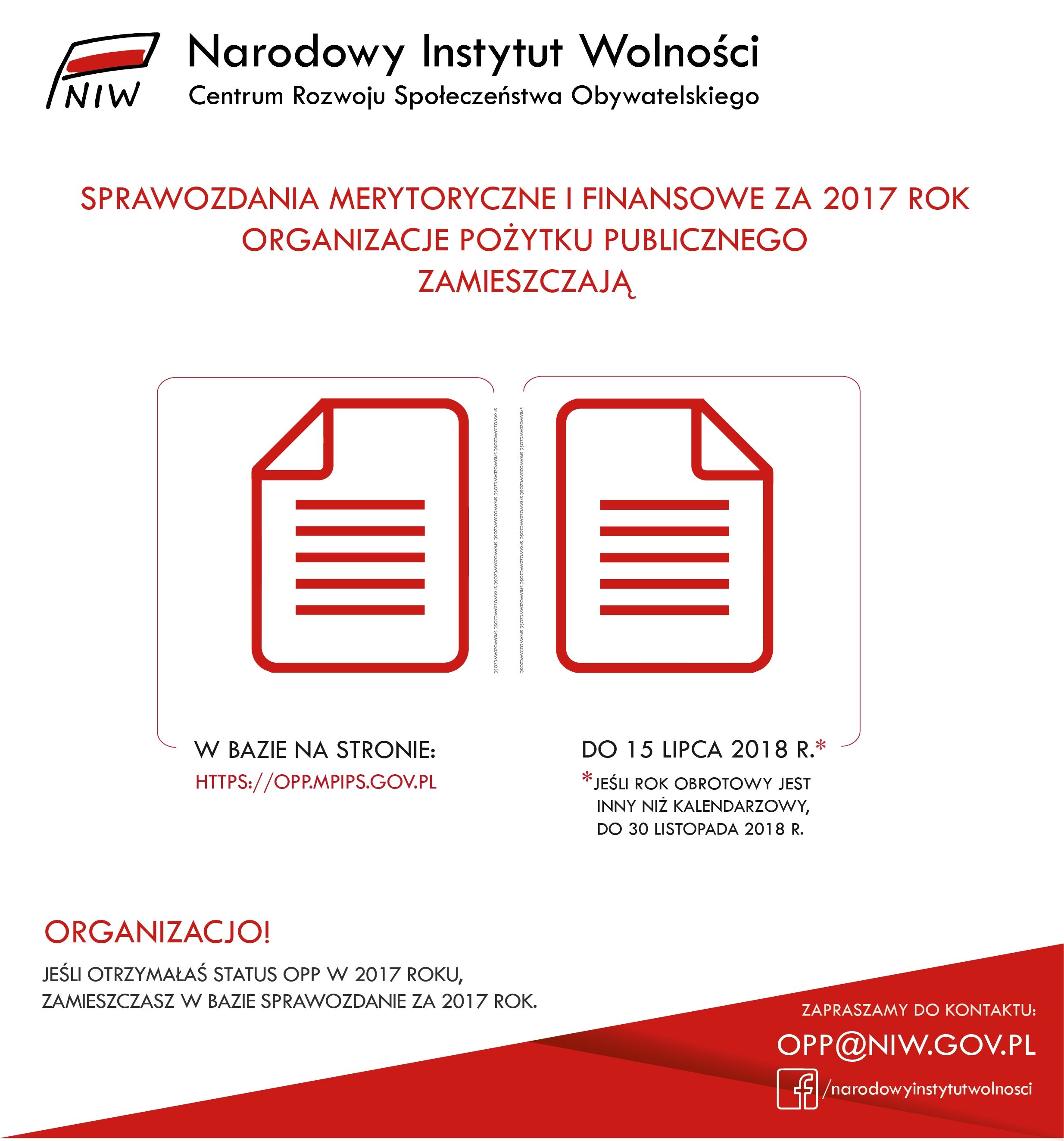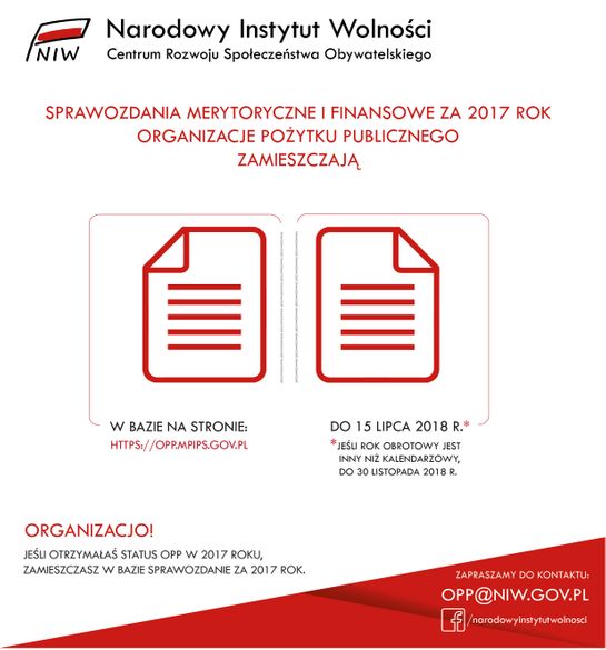 Organizacje pożytku publicznego mają dodatkowy obowiązek sprawozdawczy. Realizują go za pośrednictwem bazy w internecie. Już w tym roku bazą sprawozdań OPP zajmuje się nowa instytucja – Narodowy Instytutu Wolności. NIW, pytany o to, gdzie składać sprawozdania, odsyła pod adres, który znany jest organizacjom pożytku od kilku lat.