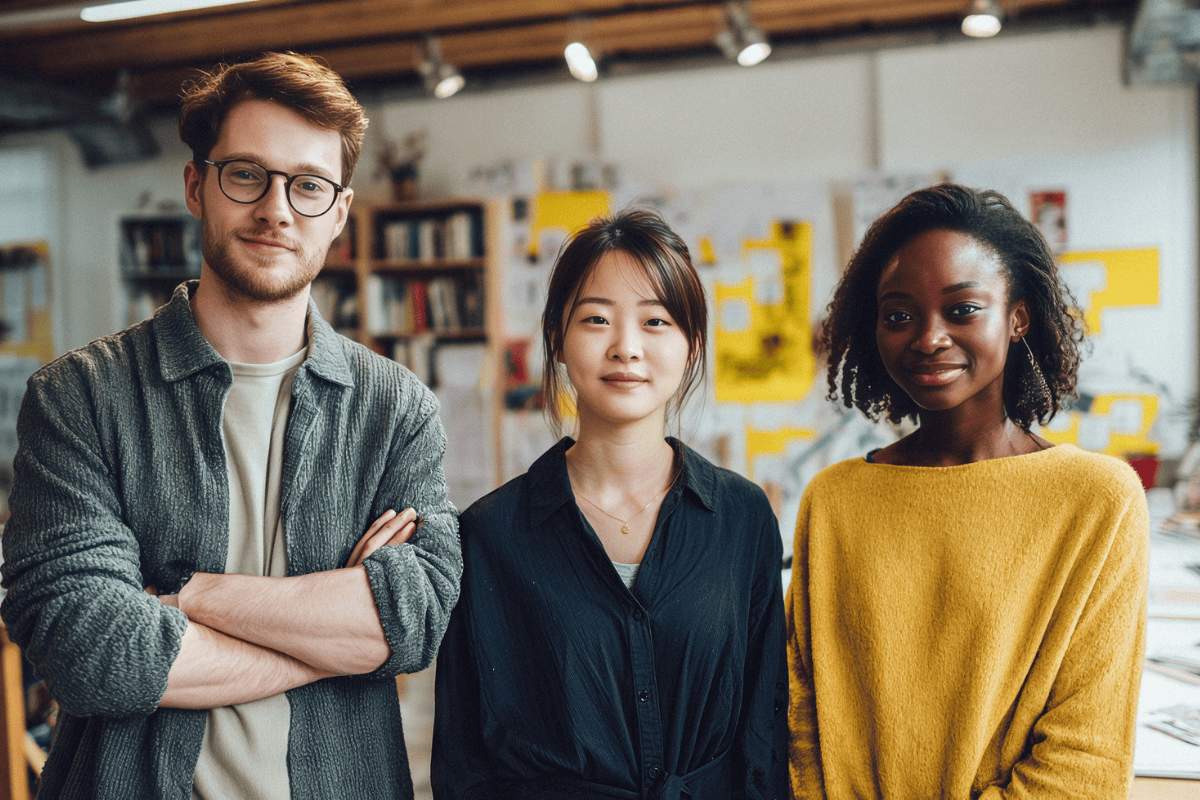 Na zdjęciu widać trzy młode osoby stojące obok siebie w jasnym, nowoczesnym biurze. Po lewej stronie stoi mężczyzna w okularach, z krótkimi, rudawymi włosami i zarostem, ubrany w jasny T-shirt i szarą, rozpiętą koszulę. W środku znajduje się kobieta o ciemnych, upiętych włosach, ubrana w czarną koszulę. Po prawej stronie stoi kobieta z krótkimi, kręconymi włosami, ubrana w luźny, żółty sweter. W tle widoczne są regały z książkami i tablice z przypiętymi notatkami.