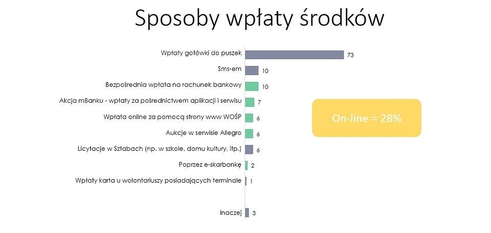 Biorąc pod uwagę wyniki ostatniego Finału oraz proporcje pomiędzy zbiórką publiczną, oraz wpłatami poprzez kanały elektroniczne, powyższy wynik świadczy, że średnio wpłaty kanałami elektronicznymi były wyższe na osobę niż „do puszki”.