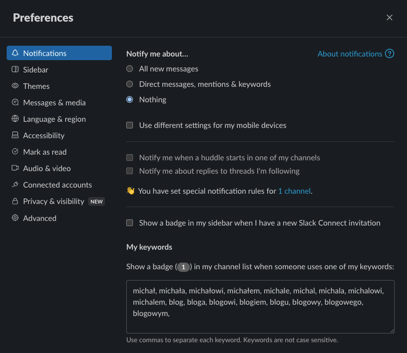 Jeśli boisz się, że ominą cię ważne dla ciebie tematy, możesz dodatkowo dołożyć kilka fraz w polu na dole. Slack wyśle ci specjalne powiadomienie, jeśli ktoś użyje danego słowa.
