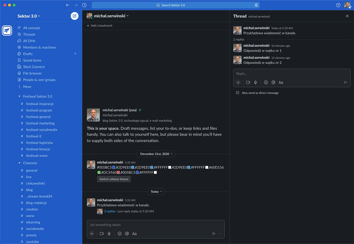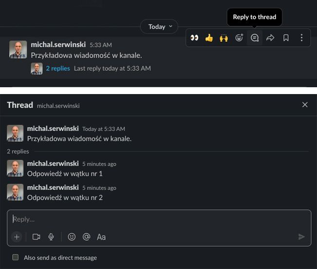 Wykorzystanie dedykowanych kanałów i czatów to podstawowe sposoby organizacji komunikacji na Slacku. Dzięki nim możemy znacznie zawęzić i doprecyzować adresatów i adresatki naszych wiadomości. Wątki (threads) pozwalają nam dodatkowo odpowiedzieć na daną wiadomość tylko osobom zainteresowanym bez konieczności powiadamiania o sprawie wszystkich obecnych w kanale/czacie.