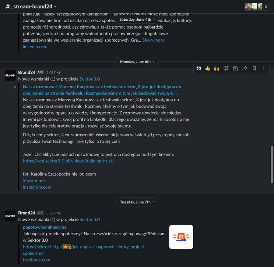 Mocną stroną komunikatora Slack jest możliwość integrowania go z innymi popularnymi aplikacjami i serwisami. W ten sposób zespół jest w stanie oszczędzić trochę cennego czasu, który zazwyczaj przeznaczał na przeskakiwanie pomiędzy narzędziami. Slack udostępnia cały zbiór możliwych połączeń. Inną opcją jest skorzystanie z aplikacji Zapier czy IFTTT. W zespole Sektor 3.0 korzystamy np. z integracji Slacka z Brand24, dzięki której możemy śledzić w aplikacji publiczne wzmianki dotyczące programu.