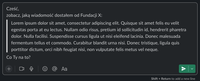 Skoro mowa o integracjach i połączeniu Slacka z innymi narzędziami, nie można ominąć poczty e-mail. Slack jest w stanie z powodzeniem wyeliminować maile w komunikacji wewnętrznej. Opcji na przekazanie treści e-maila wewnątrz Slacka mamy kilka. Możemy po prostu wkleić zrzut ekranu e-maila lub zacytować konkretną treść.
