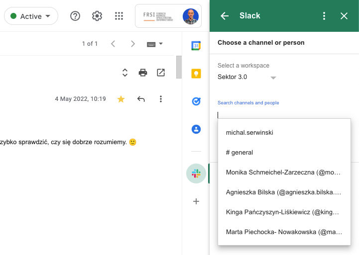 Jeśli w zespole korzystacie ze Slacka i Google Workspace dla NGO, możecie także skorzystać z integracji Slack for Gmail, która pozwala postować e-maile do wybranych kanałów bezpośrednio ze skrzynki.
