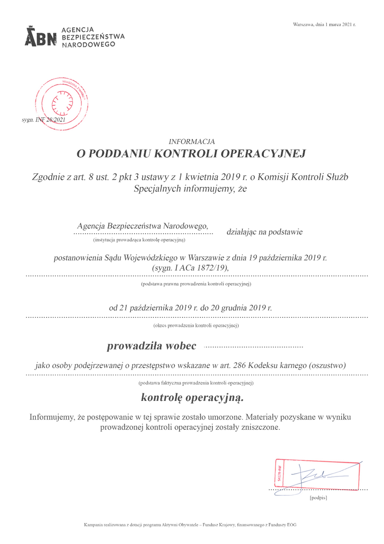 Do wszystkich parlamentarzystów i parlamentarzystek trafił przygotowany przez Panoptykon wzór powiadomienia o inwigilacji prowadzonej przez nieistniejącą Agencję Bezpieczeństwa Narodowego. W ten sposób Fundacja pokazała parlamentarzystom i parlamentarzystkom, jak w praktyce mogłyby działać postulowane przez nią rozwiązania.