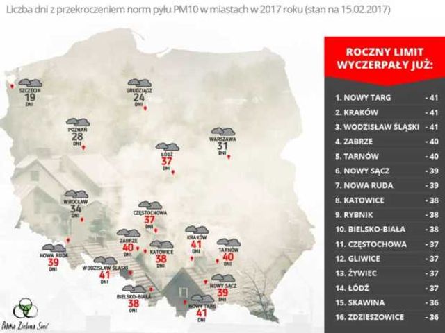 Od początku roku minęło zaledwie półtora miesiąca, a 16 polskich miast już przekroczyło dopuszczalny, roczny limit dni z przekroczeniem norm jakości powietrza – alarmuje Polska Zielona Sieć.