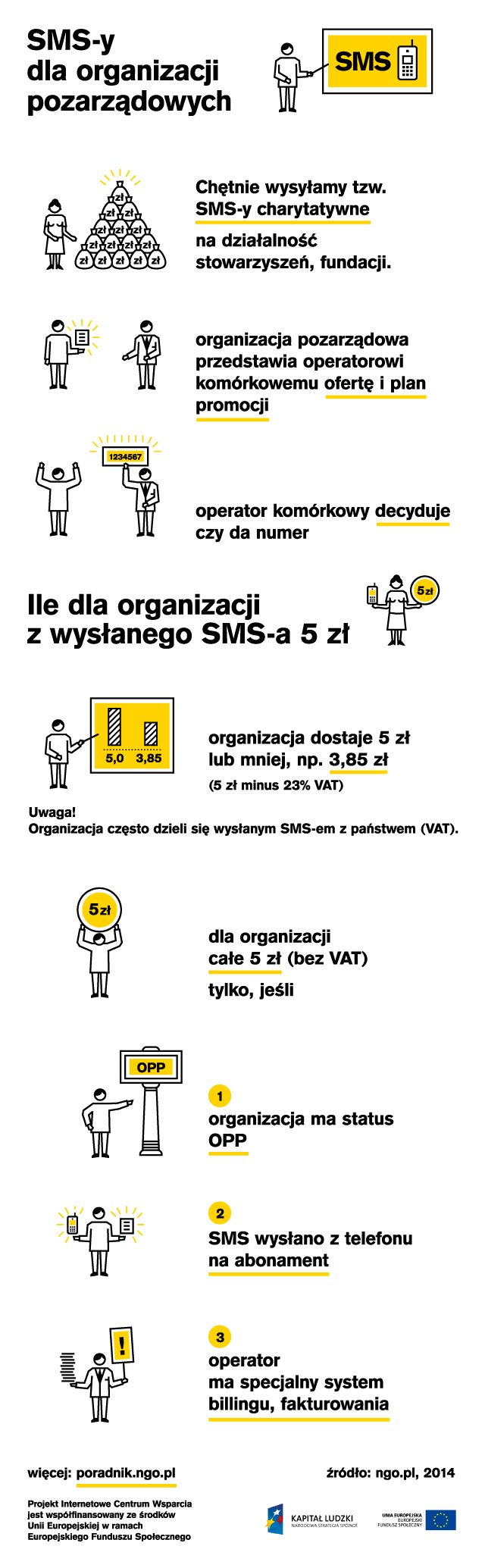 Kwestie związane z tzw. SMS-ami charytatywnymi (formalnie: z SMS-ami Premium – usługą o podwyższonej opłacie) reguluje ustawa Prawo telekomunikacyjne (Dz. U. z 2014 r., poz. 243; art. 64). Nakłada ona na organizację i operatorów wiele wymogów. Wiele zależy też od rozwiązań przyjętych przez samych operatorów.