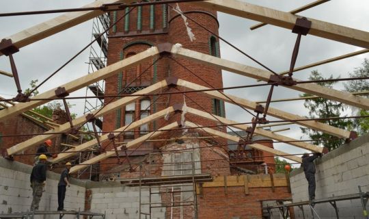 Kolejny etap budowy EkoWieży - dziś montaż więźby dachowej nad pawilonem sali multimedialnej.