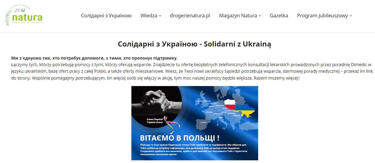 Ponad 100 ofert pracy, interaktywna mapa z punktami pomocy, miejsca, gdzie można otrzymać numer PESEL, samouczek języka polskiego do ściągnięcia na telefon, oferta bezpłatnych telekonsultacji medycznych w języku ukraińskim z internistą, ginekologiem, chirurgiem i pediatrą, oferty opieki nad dzieckiem. To wszystko na uruchomionej przez spółkę Natura platformie Solidarni z Ukrainą https://klubnatura.pl/pages/solidarni-z-ukraina. Strona powstała, aby skupić w jednym miejscu wszystkie najbardziej potrzebne informacje dla osób, które schroniły się w Polsce przed wojną w Ukrainie.