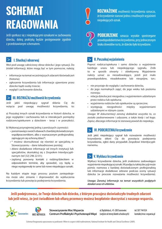 Oczywiście istnieją czynniki utrudniające rozpoznawanie krzywdzenia dzieci. Nie powinny one jednak powstrzymywać profesjonalistów przed działaniami mającymi na celu zapobieganie negatywnym skutkom krzywdzenia. Stąd nasz pomysł na opracowanie schematu postępowania w sytuacji rozważania lub podejrzewania krzywdzenia dzieci – dodaje Adrian Drdzeń, Prezes Stowarzyszenia Moc Wsparcia.