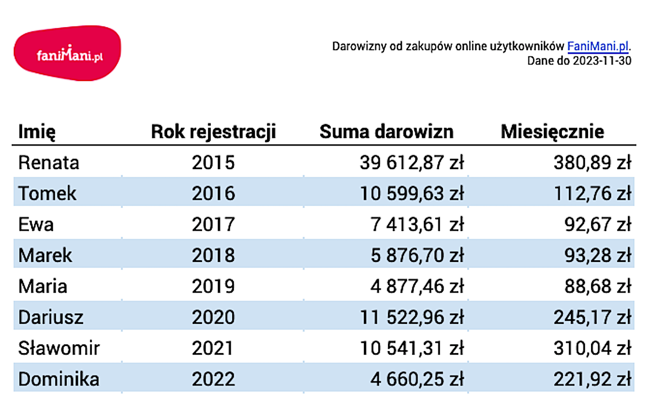 Przykład? Tomek od 2016 roku regularnie wspiera wybraną organizację kwotą średnio 112,76 zł miesięcznie, co dało w sumie ponad 10 tysięcy zł. Dominika, która dołączyła do FaniMani w 2022, podarowała w ten sposób już 4660,25 zł, co daje aż 221,92 zł miesięcznie!