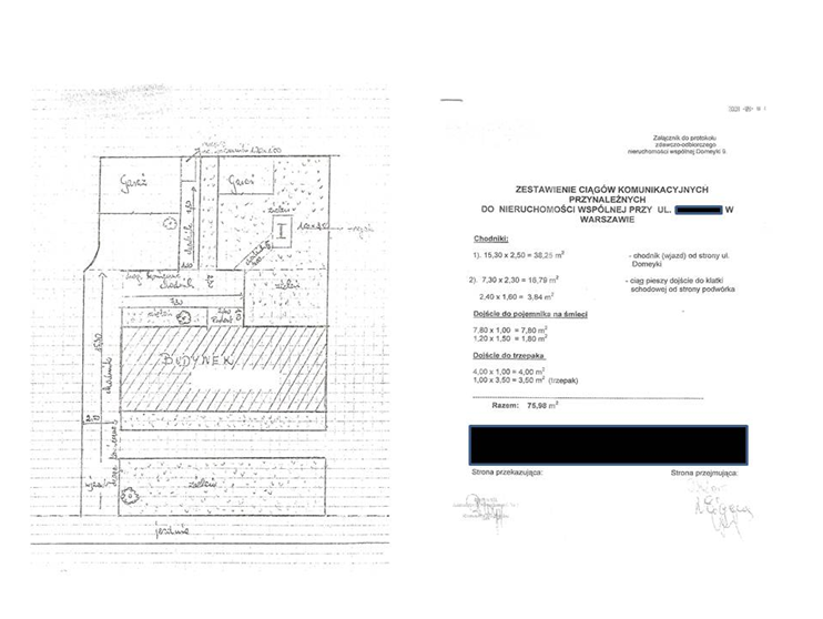 Poniższa ilustracja pokazuje podział jednolitego terytorium wspólnoty mieszkaniowej obejmującej 6 mieszkań, w tym udział gminy. Podziały terytorium są równocześnie podziałami władania i odpowiedzialności za odśnieżanie i inne obowiązki, między wspólnotą a miastem. Po co potrzebna jest miastu własność kawałeczków trawnika otaczającego trzepak – trudno powiedzieć.