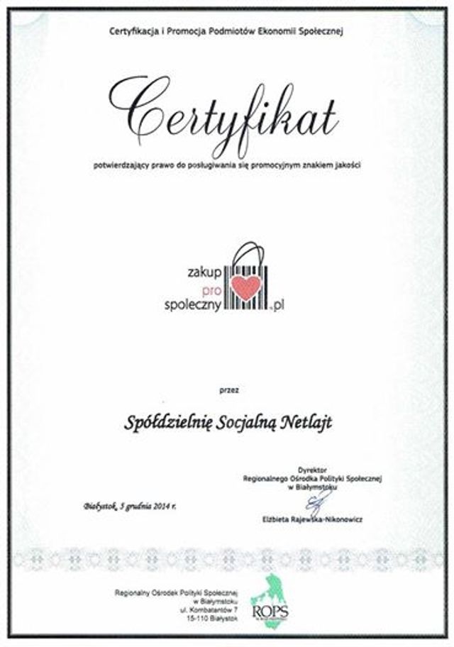 Należy podkreślić, że to kolejne wyróżnienie dla Spółdzielni socjalnej Netlajt, po otrzymaniu nagrody PwC (udział w programie dla liderów przedsiębiorstw społecznych) na gali „Przedsiębiorstwo Społeczne Roku” w Pałacu Prezydenckim, teraz członkowie łomżyńskiego podmiotu ekonomii społecznej zostali wyróżnieni znakiem jakości „Zakup Prospołeczny”.
