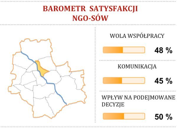 BAROMETR SATYSFAKCJI NGO-SÓW – wyraża poziom satysfakcji, jaki odczuwają organizacje pozarządowe ze współpracy z Dzielnicą. Prezentowane wyniki (we wszystkich trzech kategoriach) są średnią ocen, które wystawili członkowie Prezydium Dzielnicowej Komisji Dialogu Społecznego.