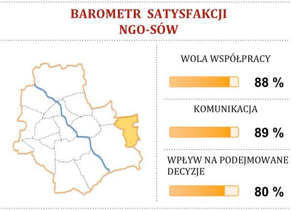 BAROMETR SATYSFAKCJI NGO-SÓW – wyraża poziom satysfakcji, jaki odczuwają organizacje pozarządowe ze współpracy z Dzielnicą. Prezentowane wyniki (we wszystkich trzech kategoriach) są średnią ocen, które wystawili członkowie Prezydium Dzielnicowej Komisji Dialogu Społecznego.
