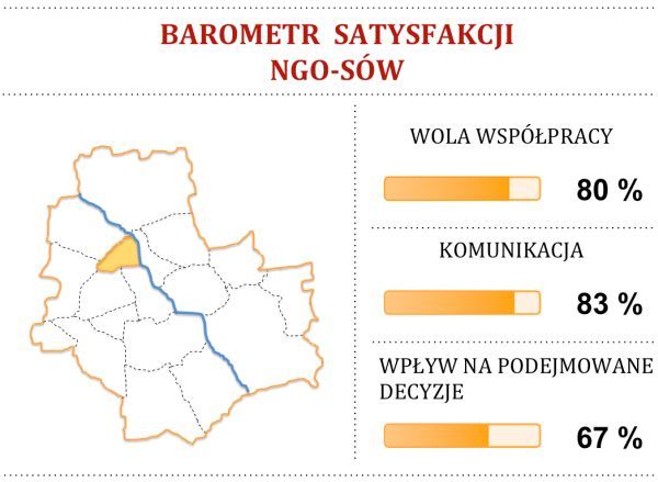 BAROMETR SATYSFAKCJI NGO-SÓW – wyraża poziom satysfakcji, jaki odczuwają organizacje pozarządowe ze współpracy z Dzielnicą. Prezentowane wyniki (we wszystkich trzech kategoriach) są średnią ocen, które wystawili członkowie Prezydium Dzielnicowej Komisji Dialogu Społecznego.