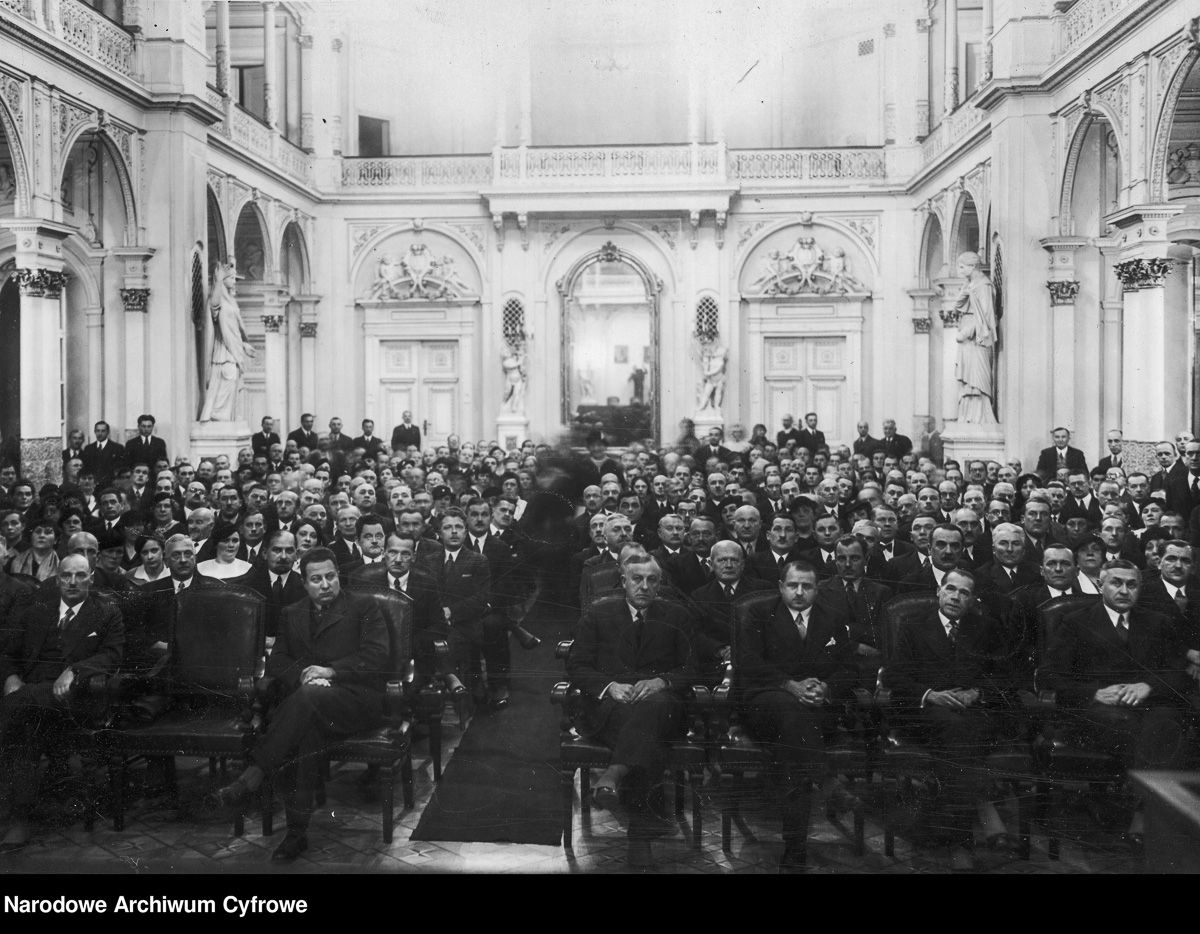 Kurs dla opiekunów społecznych w sali Rady Miejskiej w Warszawie. Ogólny widok sali podczas inauguracji kursu. Widoczni m.in.: prezydent Warszawy Stefan Starzyński (I rząd 3. z prawej), komisarz Rządu na m.st. Warszawę Władysław Jaroszewicz (I rząd 4. z prawej), wiceprezydent Warszawy Józef Ołpiński (I rząd 1. z lewej), 1934 rok.