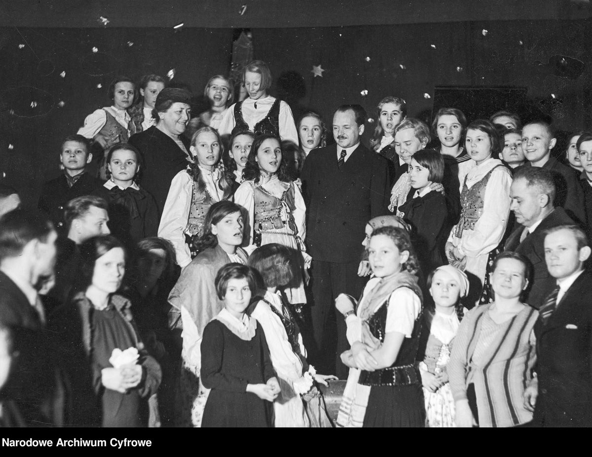 Wizyta ministra opieki społecznej Mariana Zyndrama Kościałkowskiego w warszawskich świetlicach, gdzie odbywały się zabawy sylwestrowe dla bezrobotnych. Minister opieki społecznej Marian Zyndram Kościałkowski (stoi w środku) z wizytą w świetlicy na Żoliborzu, 1936 rok.