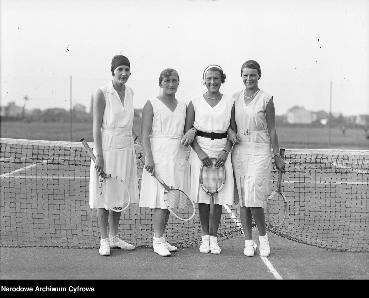 Turniej tenisowy o mistrzostwo polskich sokołów zorganizowany w Krakowie przez Towarzystwo Gimnastyczne „Sokół”. Tenisistki z krakowskiego „Sokoła” biorące udział w turnieju tenisowym. Stoją od lewej: Stanisława Bielecka, Misiąg, Sawicka i Parafińska. 1931 rok.