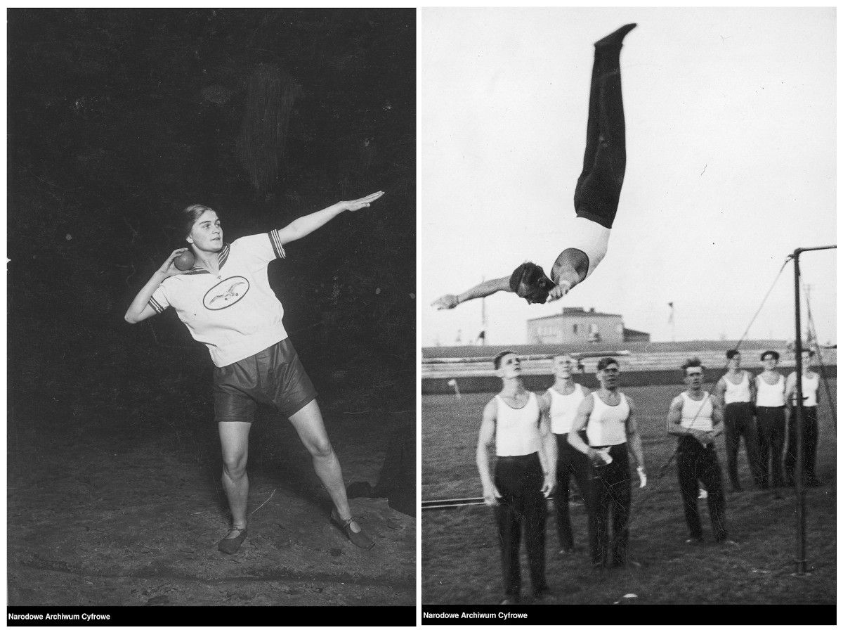 Z lewej: członkini „Sokoła” w stroju gimnastycznym, podczas próby pchnięcia kulą, 1926 rok. Z prawej: zlot jubileuszowy okręgu śląskiego Towarzystwa Gimnastycznego „Sokół” w Katowicach, zawodnik Wilhelm Breguła podczas zeskoku z drążka gimnastycznego, 1935 rok.