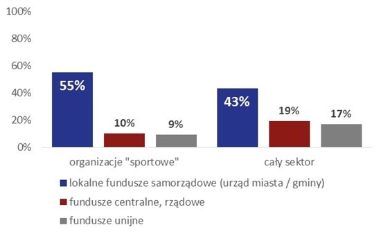 Niewielkie budżety związane są ze specyficznymi źródłami finansowania, z których korzystają organizacje „sportowe”. Stosunkowo częściej niż pozostałe są one bowiem finansowane ze środków lokalnych samorządów. Dotację od urzędu miasta lub gminy otrzymało w 2014 aż 55% z nich. Wspomniane dotacje są jednak w porównaniu do środków z innych źródeł (na przykład centralnych czy unijnych) dość niewielkie i nie przekładają się na wysokie budżety organizacji. Z kolei te fundusze, które są na ogół duże i mogłyby dużo „ważyć” w budżecie organizacji (centralne, unijne), są przez organizacje „sportowe” wykorzystywane dość rzadko. Z dotacji od ministerstw i administracji centralnej korzystało w 2014 roku 10% organizacji „sportowych”, a z funduszy unijnych (łącznie ze środkami Komisji Europejskiej) 9%.