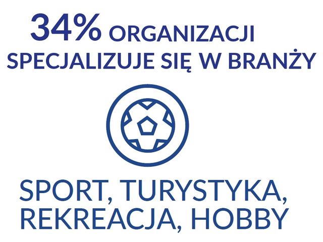 Sport, turystyka, rekreacja i hobby – to podstawowy obszar działalności dla 34% organizacji pozarządowych. Choć to nieco mniej niż w poprzednich latach, to i tak jest to najbardziej popularna sfera aktywności polskich fundacji i stowarzyszeń. Organizacje „sportowe” to niezmiennie największa branża sektora pozarządowego.