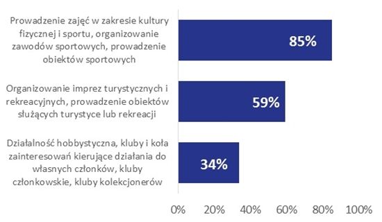 Sport, turystyka, rekreacja i hobby to dość pojemna kategoria, mieszcząca różne obszary tematyczne. Co więc w praktyce oznacza podejmowanie działalności w tym obszarze? Wróćmy do tych organizacji, dla których jest on podstawową sferą działania. Zdecydowana większość (85%) organizacji „sportowych” zajmuje się prowadzeniem zajęć w zakresie kultury fizycznej i sportu, organizowaniem zawodów sportowych i prowadzeniem obiektów sportowych. Ponad połowa (59%) organizacji aktywnych we wspomnianym obszarze organizuje imprezy turystyczne i rekreacyjne lub prowadzi obiekty służące turystyce lub rekreacji. Działalnością hobbystyczną zajmuje się natomiast jedna trzecia (34%) organizacji „sportowych”.