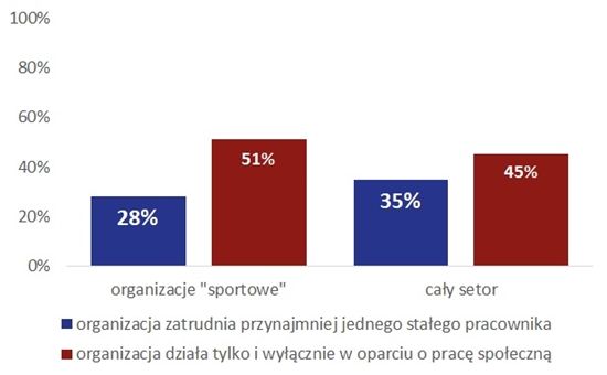 Kolejną cechą, która wyróżnia organizacje „sportowe”, jest także wysoki odsetek fundacji i stowarzyszeń opierających się wyłącznie na pracy społecznej. W całym sektorze pozarządowym organizacji, które w żaden sposób nie płacą za pracę na swoją rzecz, opierając się na społecznej pracy swoich członków lub wolontariuszy, jest 45%. Natomiast wśród organizacji „sportowych” – 51%. Jednocześnie, tylko 28% fundacji i stowarzyszeń aktywnych w obszarze sportu, turystyki, rekreacji i hobby zatrudnia choćby jednego stałego pracownika. W całym sektorze takich organizacji jest natomiast 35%.