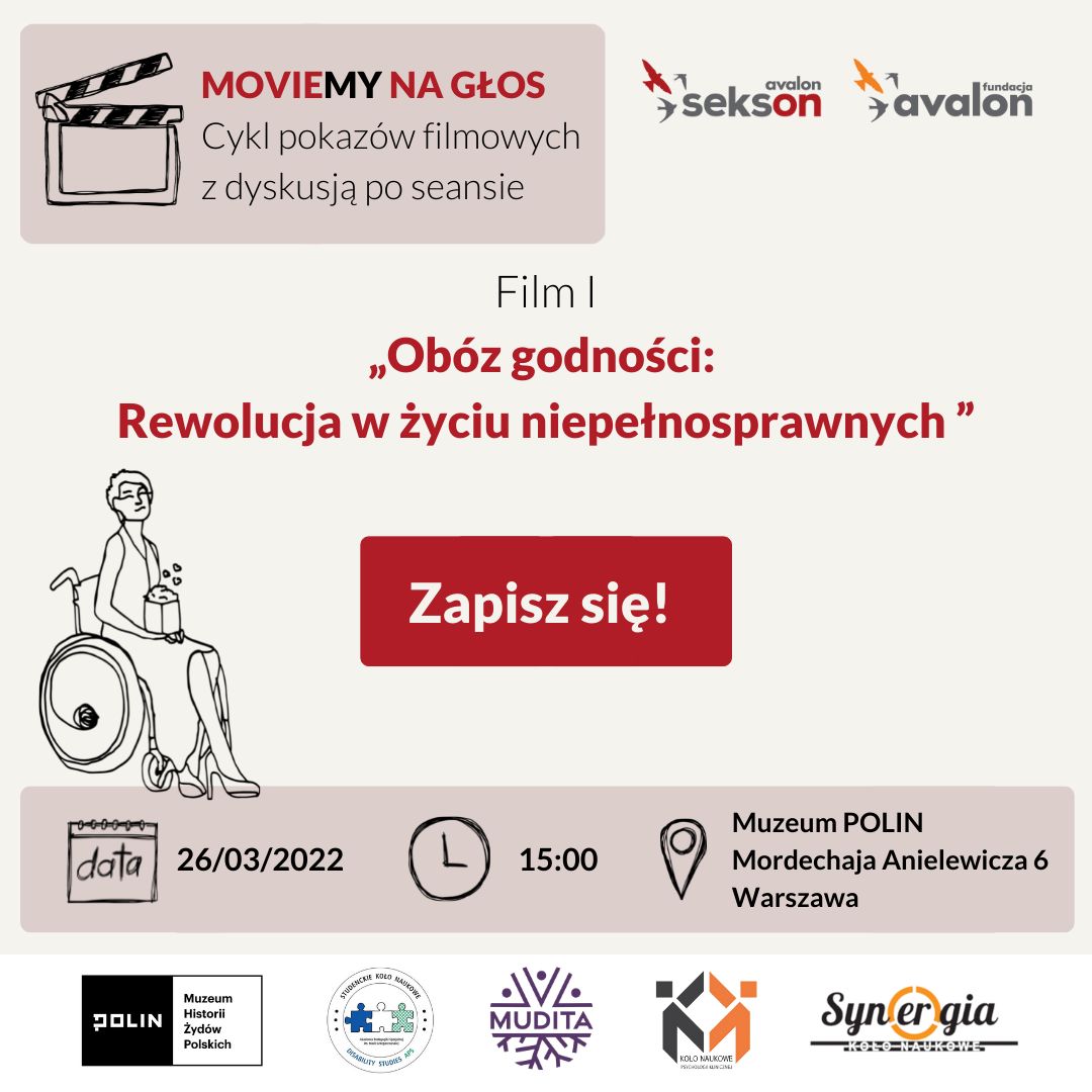 Pierwszy pokaz filmowy rozpocznie się już 26 marca 2022 roku o godz. 15:00. Podczas spotkania będzie można obejrzeć nagrodzony wieloma nagrodami dokument „Obóz godności. Rewolucja w życiu niepełnosprawnych”, który podejmuje temat powstania amerykańskiego ruchu praw osób z niepełnosprawnościami. Co ciekawe, część jego członków stała się aktywistami, którzy przyczynili się do stworzenia jednego z najważniejszych dokumentów dla grupy osób z niepełnosprawnościami w Stanach Zjednoczonych – ustawy o niepełnosprawności.