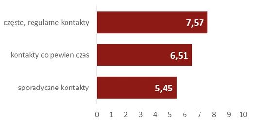 Ostatnia zależność wydaje się być zrozumiała: organizacje są skłonne oceniać pozytywnie współpracę z samorządem między innymi wtedy, kiedy ma ona finansowy charakter i wiąże się dla stowarzyszenia lub fundacji z dotacją, która może być przeznaczona na realizację działań statutowych. Warto jednak zwrócić uwagę na pierwszą z wymienionych zależności: organizacje biorące udział w konsultacjach oceniają współpracę z samorządem lepiej niż pozostałe. Choć zależność jest tutaj wyraźna, trudno decydować jednoznacznie o jej kierunku. Być może niechęć do udziału w konsultacjach spowodowana jest właśnie niską oceną jakości współpracy z samorządem. Ale możliwy jest też odwrotny scenariusz: to brak udziału w konsultacjach oraz powiązany z tym raczej sporadyczny charakter kontaktów między partnerami wpływa na niską ocenę współpracy. Za takim wytłumaczeniem przemawiają wyniki dalszych analiz: organizacje kontaktujące się z urzędami regularnie oceniają współpracę lepiej (7,57 pkt.), niż te kontaktujące się co pewien czas (6,51 pkt.) lub sporadycznie (5,45 pkt.). Oznacza to, że generalnie im bliższy i bardziej intensywny kontakt pomiędzy partnerami, tym więcej szans na wzajemne zrozumienie, kompromis i wspólne działanie w pożądanym przez obie strony kierunku.