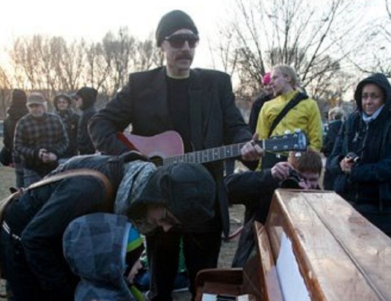 Mieszkańcy squatu i członkowie jego kolektywu przyjechali wczoraj starym busem pod noclegownię dla bezdomnych przy ul. Stawki. Wynieśli pianino, bębny, pompowane materace, a nawet rowerowe składaki. Chłopak w ciemnych okularach grał na gitarze i śpiewał piosenkę, która powstała specjalnie na tę okazję: "Bo walc to jest taniec, prosty jak kaganiec. Dla jednych komisja, dla drugich eksmisja. By ogół mieszkańców nie mylił się w tańcu. Tu są wyższe sfery, a tam kontenery. Walc, walc, chcesz mieszkanie, to walcz".