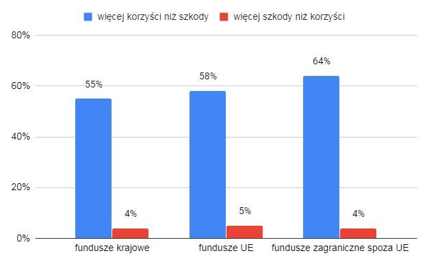 Możemy z kolei przyjrzeć się ogólnemu stosunkowi polskich organizacji wobec korzystania z różnego typu środków publicznych. W ramach tego samego badania zapytaliśmy, czy środki te przynoszą więcej korzyści niż szkody, czy też może odwrotnie – więcej szkody niż korzyści? W ten sposób badaliśmy nastawienie do funduszy krajowych, unijnych oraz zagranicznych spoza UE (takich jak środki norweskie).
